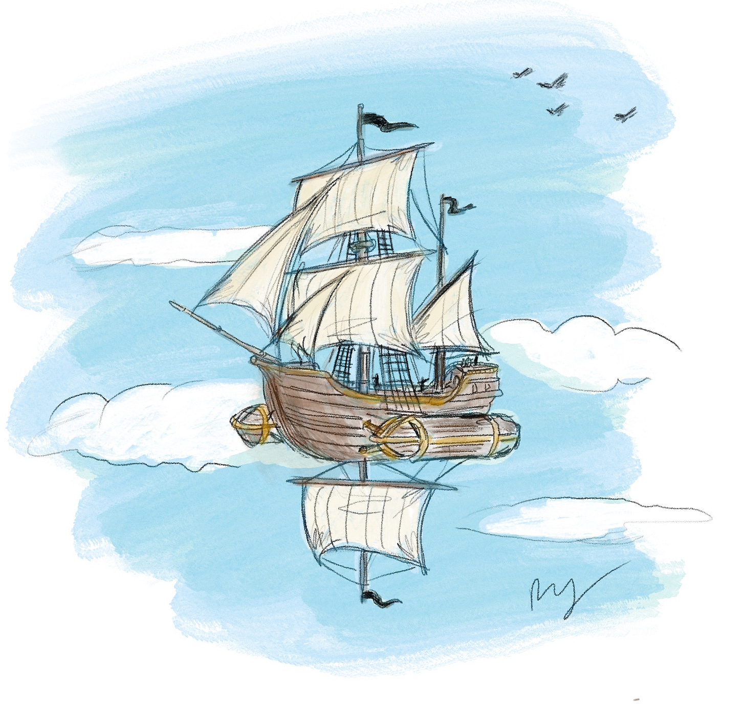 The quarterdeck jutted from the rear of the ship like a balcony over the clouds, its brass railings glinting in the sun. Just past the railing stretched the pylons that held leviathan’s breath: two long, slim wooden tanks banded by bronze, one on either side of the ship, inside which lay the miraculous buoyant gas that kept the ship flying.