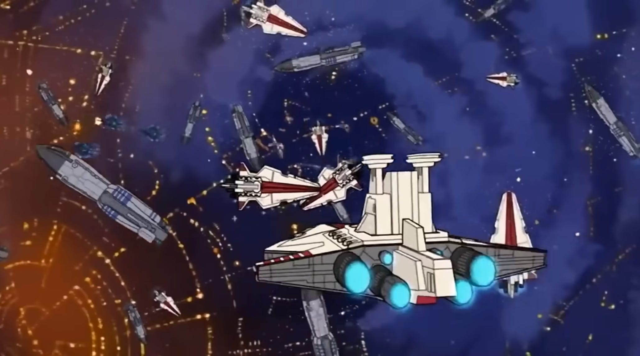 Interestingly enough, the only time I’ve ever seen Star Wars ships not arranged on the same plane is in the dubiously canon but still beloved animated Clone Wars series from 2003, the precursor to the 2008 canon series we all know and love. Here you can see the Battle of Coruscant again, but this time they’re coming in from every direction.