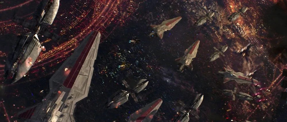 One thing about Star Wars space battles that I never really realized until I thought about it is that every ship seems to maintain the same orientation. In other words, everybody in the galaxy seems to have mutually agreed to keep their feet pointed in the same direction. X-wings and TIE fighters duke it out on a single horizontal plane, capital ships line up broadside like naval warships, and the audience always knows which way is “up.” You can see it here in the battle of Coruscant in Revenge of the Sith, for instance.